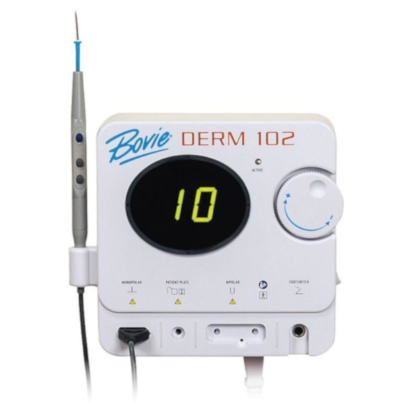 For the practitioner who wants to also use bi-polar electrosurgery along with high frequency desiccation, Bovie offers the Derm 102 High Frequency Desiccator with 10 watts of bipolar power, adjustable in 1/10th watt increments. To utilize this feature the A827V bipolar cable, a bipolar forcep and footswitch activation are required.